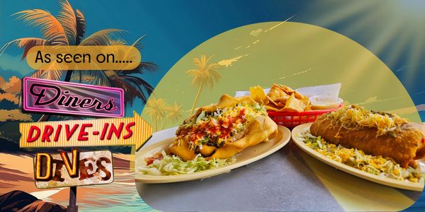 One of our featured items on Diners, Drive ins & Dives our chimichanga will not disappoint! 12" tortilla stuffed with your choice of meat, rice, beans, shredded cheese and onion. Deep fried to perfection then topped with lots of shredded cheese garnished with lettuce. Served with our red and green sauce on the side. Additional toppings are available under our add on menu.